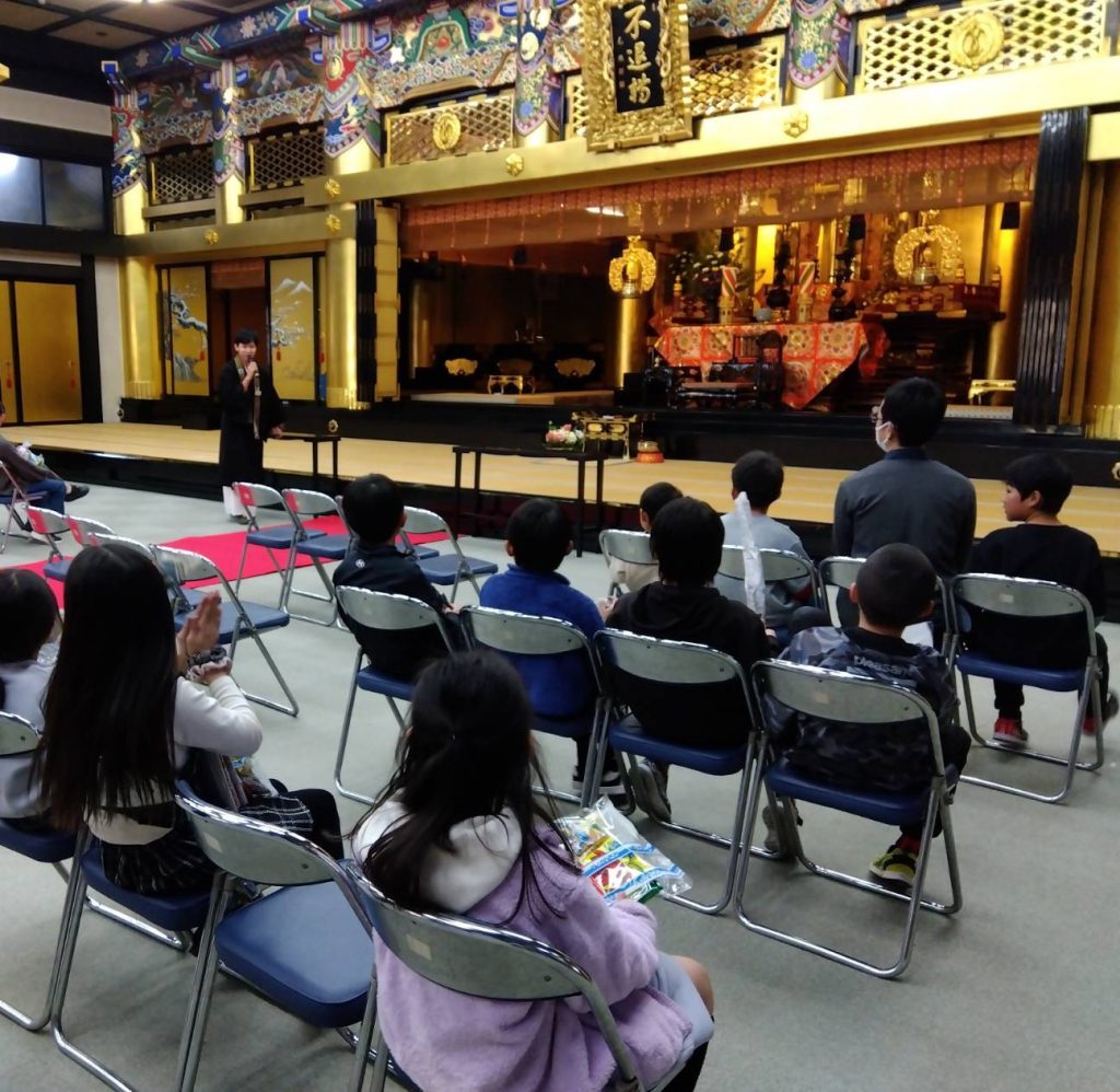 2月7日(土)に名古屋西別院の報恩講に参加しました。阿弥陀さまにお参り・お勤めをしたあと、お話を聞きました。その後はグループに分かれてゲームをして遊びました。新聞を使った文字探しゲームでは、お話の中で教えていただいだ「あみださま」「しんらんさま」などの文字を探しました。新聞の中にはたくさんの文字がありますが、特定の文字を探すのは大変でした。
